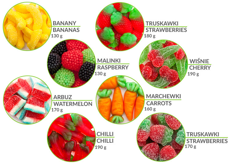 Pyszne żelki w wybranym kształcie, zapakowane są w przezroczystą torebkę, która zamknięta jest karnetem.