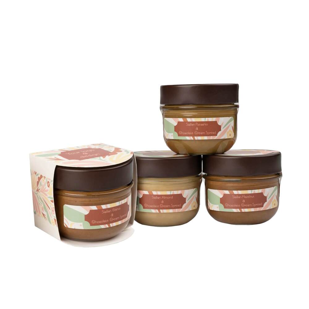 Zainspirowani smakiem sycylii wprowadziliśmy słodką nowość do oferty! Orzechowe kremy na bazie białej czekolady i masła. Oferujemy 4 warianty smakowe – migdał, pistacje, orzechy laskowe i orzechy włoskie.