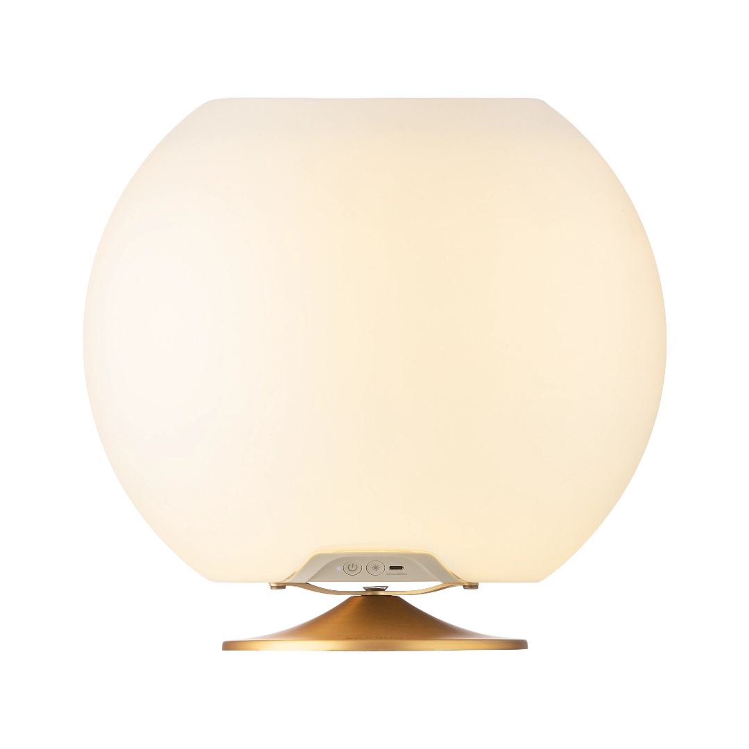Kooduu Sphere Brass to elegancki i zaokrąglony głośnik Bluetooth oraz ściemniana lampka LED z wbudowanym uchwytem na napoje w jednym. Kulisty kształt równomiernie rozprowadza ciepłe, przyciemniane światło i zrównoważony dźwięk.