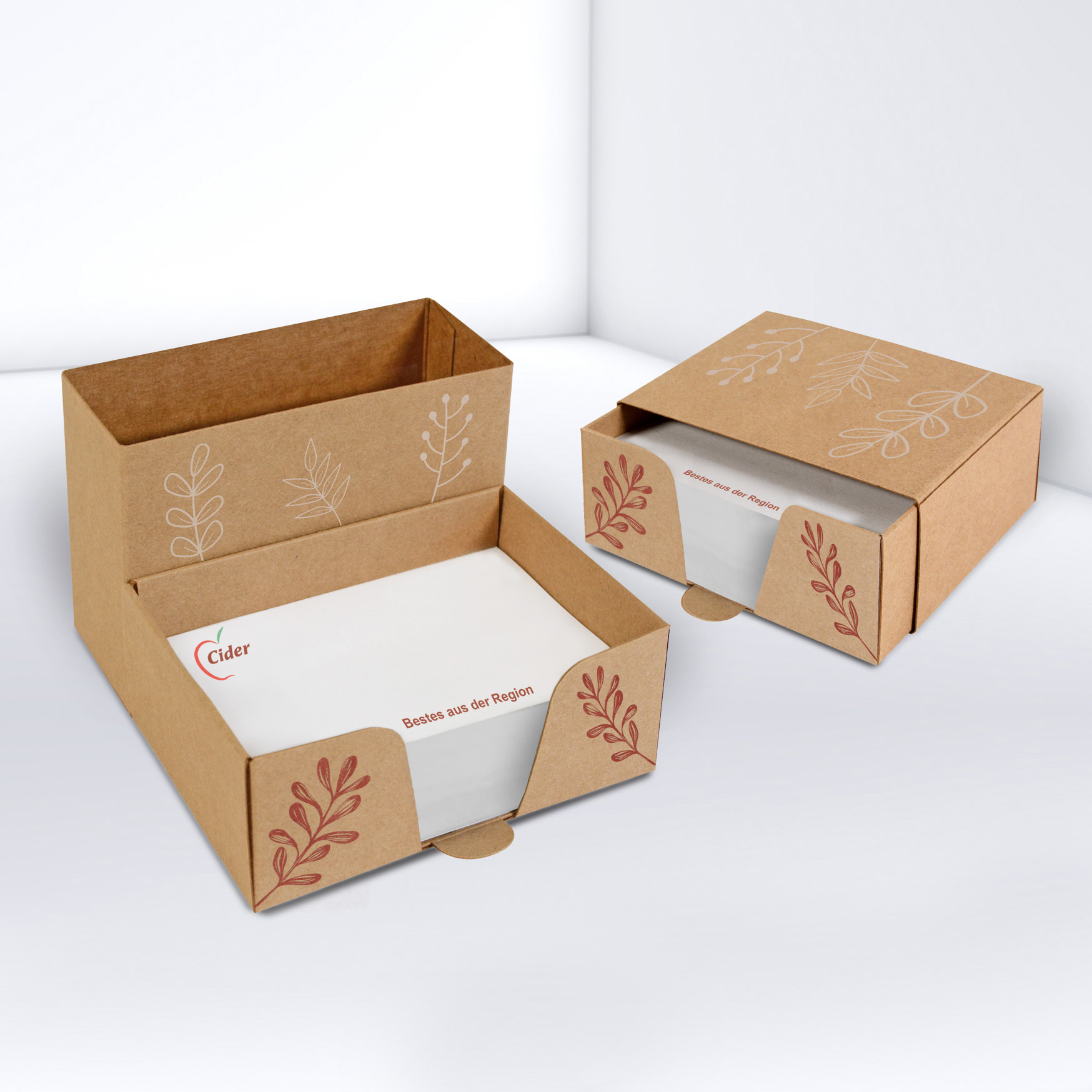 Innowacyjne pudełko kartonowe "PURE notes" z ozdobną wsuwką, które może służyć jako organizer biurowy.