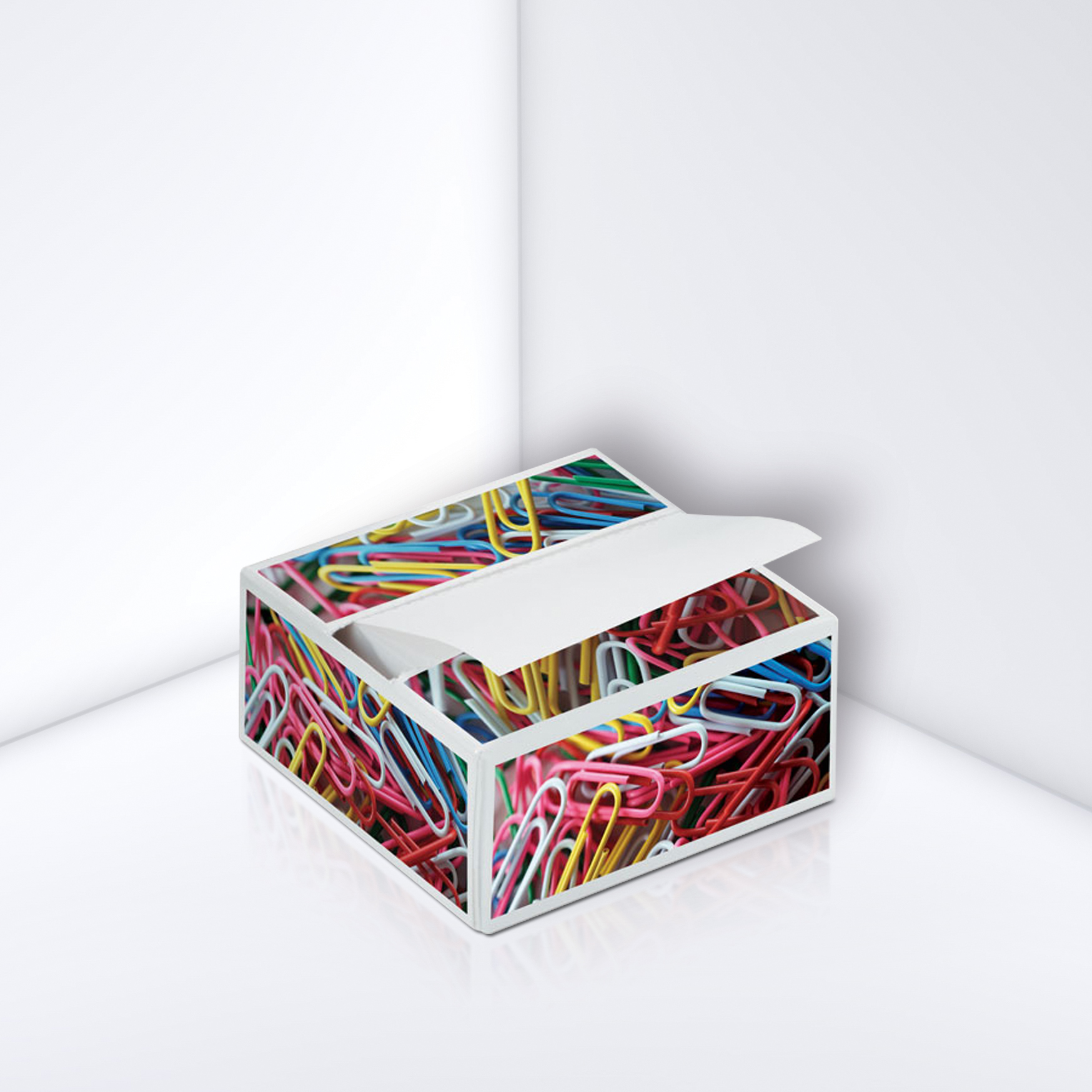 Kwadratowy dyspenser karteczek samoprzylepnych z kartonu z wyjmowanymi kartkami. Możliwość wyboru liczby kartek.