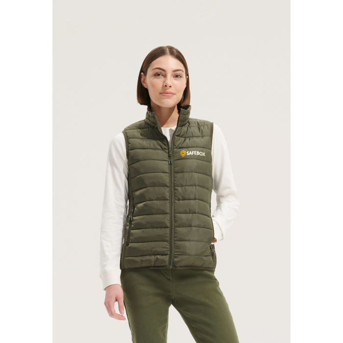 SOL'S STREAM BW WOMEN, DAMSKA LEKKA KAMIZELKA, Materiał zewnętrzny i podszewka: 100% poliester, Wypełnienie: 100% puch poliestrowy, zapięcie z przodu i kieszenie boczne z nylonowym zamkiem błyskawicznym w tonacji, metalowe suwaki w tonacji z czarnymi fantazyjnymi suwakami, wysoki kołnierz, elastyczne wiązanie na dole i pod pachami w tonacji, torba do przechowywania. Informacje na temat dopasowania rozmiarów można znaleźć w tabeli rozmiarów w sekcji dokumentacji produktu.