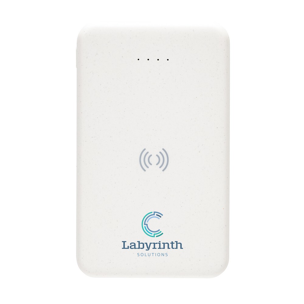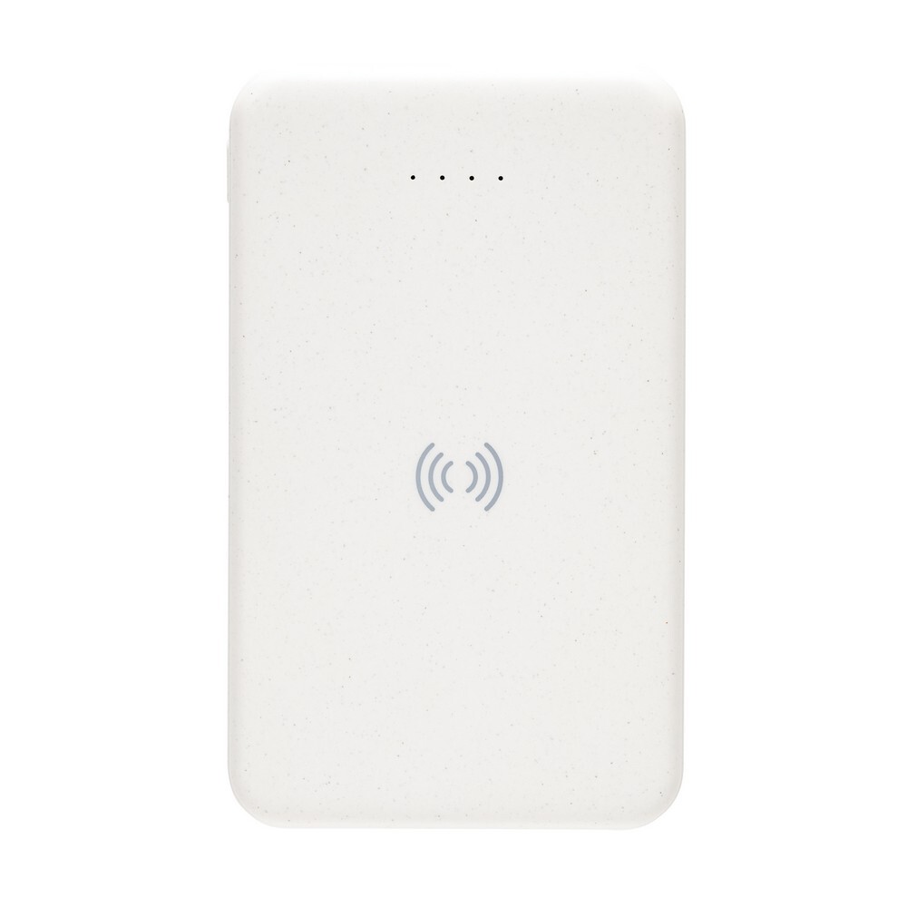 Bezprzewodowy power bank 5000 mAh, ładowarka bezprzewodowa 5W, diody wskazujące poziom naładowania, wykonany z ABS z recyklingu z certyfikatem RCS, całkowita zawartość materiałów z recyklingu obliczona na podstawie wagi całkowitej przedmiotu: 26%, wbudowany akumulator litowo polimerowy o dużej gęstości, wejście micro USB 5V/2A, wejście USB typu C 5V/2.4A, wyjście USB typu C 5V/2.4A, wyjście USB 5V/2.4A, kabel z TPE z recyklingu z certyfikatem RCS w komplecie, w pudełku z papieru kraftowego z certyfikatem FSC® mix