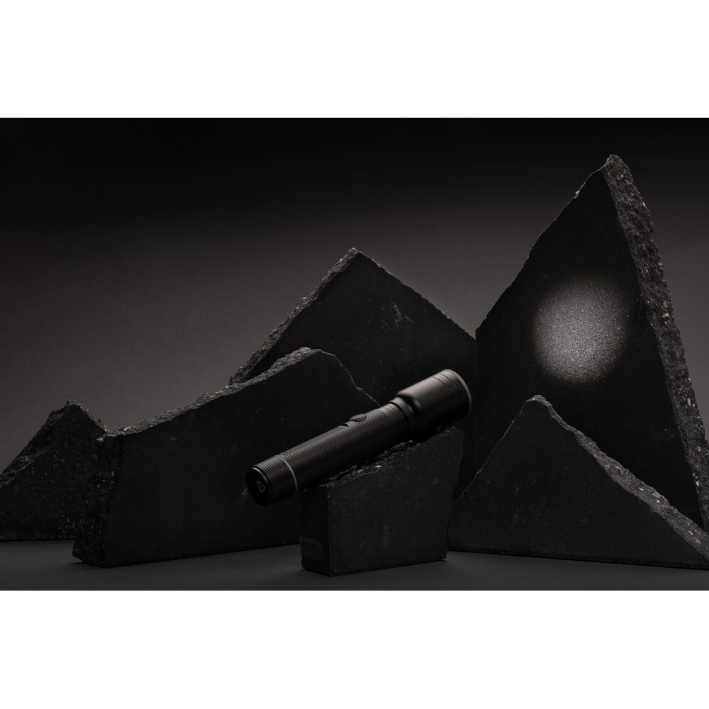Latarka 10W o bardzo jasnym świetle, wodoodporna IP4, wiązka 1500 lumenów sięgająca do 800 m, wysokiej jakości żarówka z 5 trybami świecenia, w tym SOS, wbudowany akumulator 4000 mAh pozwala na około 10 godzin ciągłego świecenia, ładowana za pomocą USB, wykonana z aluminium z recyklingu z certyfikatem RCS, całkowita zawartość materiałów z recyklingu obliczona w oparciu o wagę całkowitą przedmiotu: 20%, w pudełku z papieru kraftowego z certyfikatem FSC® mix