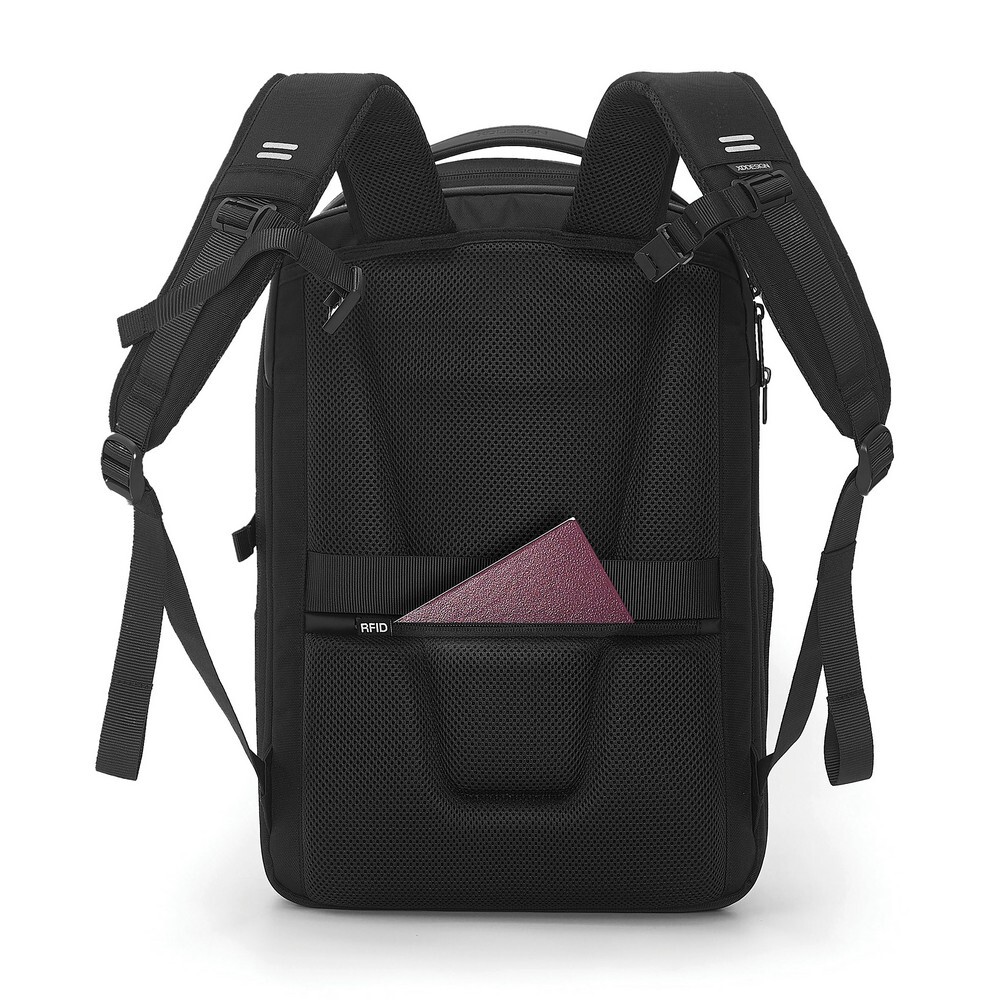 Plecak na laptopa do 16”, przegroda główna otwierana pod kątem 180 stopni, wewnątrz kieszenie z siatki, wiele kieszeni na zewnątrz, kieszeń na butelkę zamykana na magnes, kieszeń z odpinaną smyczą na klucze, wodoodporny, wykonany z materiałów pochodzących z recyklingu, posiada wbudowany znacznik AWARE™, który potwierdza wykorzystanie materiałów z recyklingu