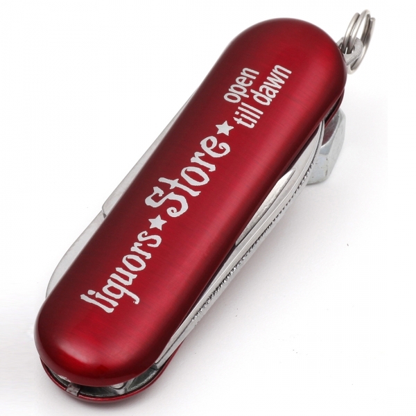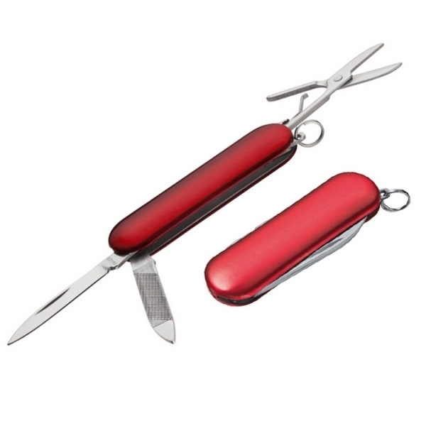 Ten poręczny scyzoryk ze stali nierdzewnej posiada 5 funkcji: nożyk, nożyczki, pilnik do paznokci, narzędzie do czyszczenia paznokci oraz brelok do kluczy. Gustowna metalowa obudowa stanowi świetne miejsce na Twój logotyp, który umieszczamy metodą graweru laserowego. Pakowany w pojedynczy kartonik. Grupa nadruku: L2.