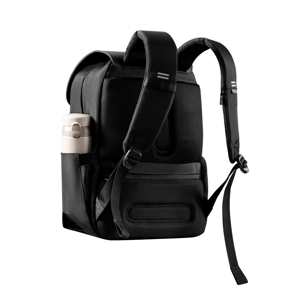 Plecak na laptopa 16”, wykonany z RPET oraz PU, klapa z systemem zamykającym Fidlock, specjalne zamki błyskawiczne zapewniające ochronę przed kieszonkowcami, kieszeń z ochroną RFID, posiada znacznik AWARE™, który jest gwarantem wykorzystania materiałów z recyklingu