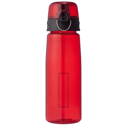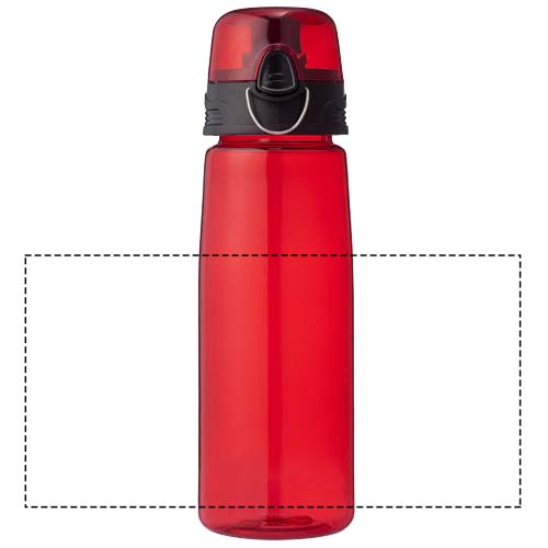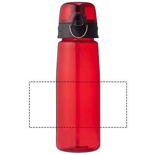 Lekka butelka sportowa Capri o pojemności 700 ml to ratunek dla spragnionych. Butelka ma otwieraną pokrywę z dzióbkiem, dzięki czemu jest chroniona i czysta. Przycisk umożliwia łatwe otwieranie. Przezroczysta butelka jest wykonana z trwałego, odpornego na plamy i nieprzyjemne zapachy materiału Eastman Tritan™, dzięki czemu jest wytrzymała i wolna od BPA.