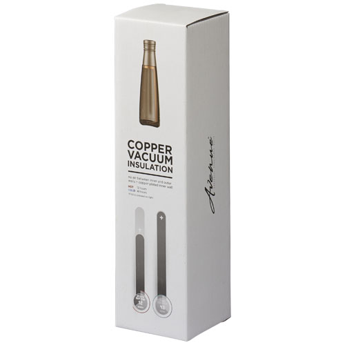 Butelka Duke z izolacją próżniową i podwójnymi ściankami ze stali nierdzewnej 18/8. Wewnętrzna ścianka pokryta jest warstwą miedzi, która zapewnia idealne przewodzenie, dzięki czemu napoje pozostają gorące przez 12, a zimne przez 48 godzin. Pojemność to 500 ml. Całość zapakowana jest w pudełko upominkowe Avenue.
