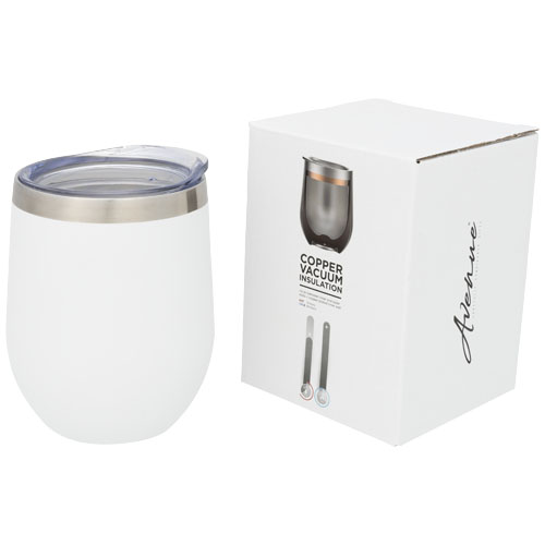Termiczny kubek Corzo z miedzi izolowany próżniowo posiada dwie warstwy izolacji z miedzi próżniowej, dzięki czemu utrzymuje temperaturę gorących napojów przez 6 godzin i zimnych przez 24 godziny. Budowa zapobiega kondensacji na zewnątrz kubka. Łatwe picie, pokrywa typu push-on. Farba proszkowa na zewnętrznej powłoce. Szeroki otwór dla wygodnego napełniania i opróżniania. Pojemność wynosi 350 ml. Zapakowany w pudełko upominkowe Avenue.