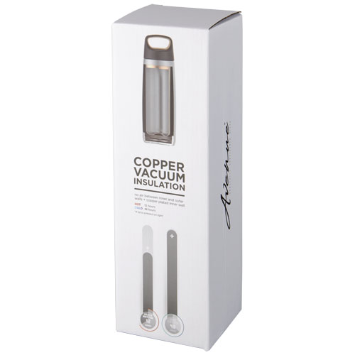 Dwuwarstwowa próżniowa konstrukcja ze stali nierdzewnej i miedziana izolacja zapewniają utrzymanie niskiej temperatury napojów przez 48 godzin i wysokiej przez co najmniej 12 godzin. Konstrukcja zapobiega również kondensacji na zewnątrz butelki. Zakręcana pokrywa z elementami korka oraz antypoślizgowe dno. Pojemność 600ml. Zapakowany w pudełko upominkowe Avenue.