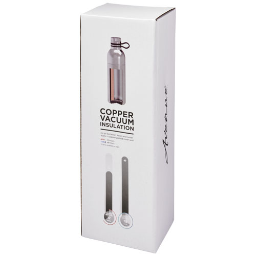 Dwuwarstwowa próżniowa konstrukcja ze stali nierdzewnej i miedziana izolacja zapewniają utrzymanie niskiej temperatury napojów przez 48 godzin i wysokiej przez co najmniej 12 godzin. Konstrukcja zapobiega również kondensacji na zewnątrz butelki. Posiada zakręcaną pokrywę górną ze stali nierdzewnej z wygodną silikonową pętlą do przenoszenia. Otwierana z dwóch stron konstrukcja ułatwiająca czyszczenie i napełnianie. Pojemność 590ml. Zapakowany w pudełko upominkowe Avenue.