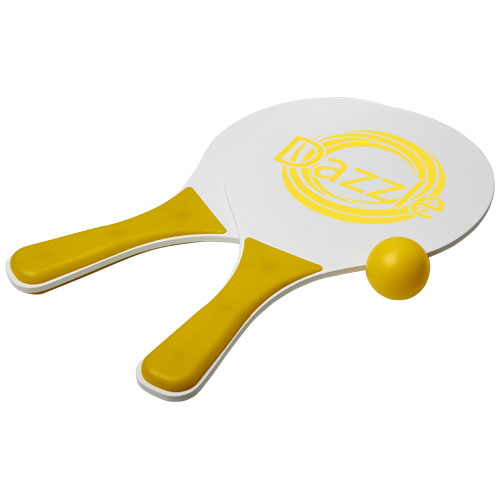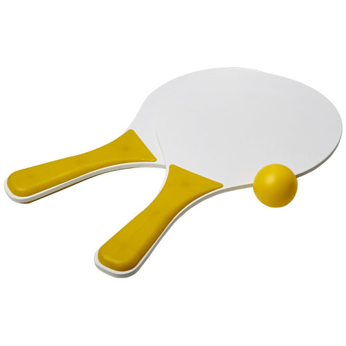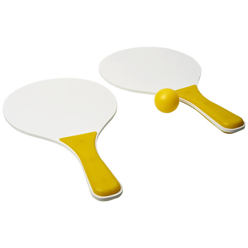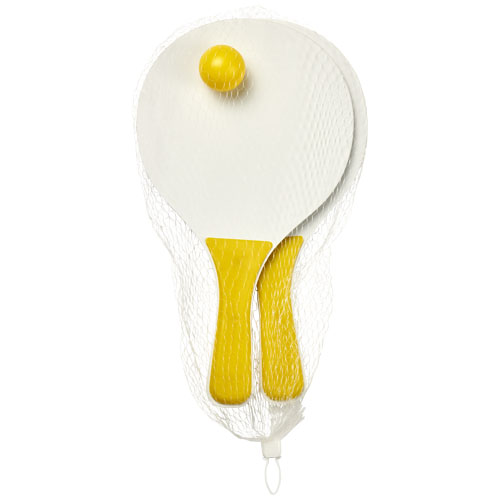 Zestaw do gier plażowych, oferowany w szerokiej gamie kolorystycznej zapewnia mnóstwo zabawy. Ten wytrzymały zestaw do gier plażowych wykonany jest z drewna MDF z kolorowym uchwytem z polipropylenu. W komplecie z miękką, kolorową piłką w siatce, umożliwiającą łatwe przenoszenie na plażę, aby umilić każdy dzień.