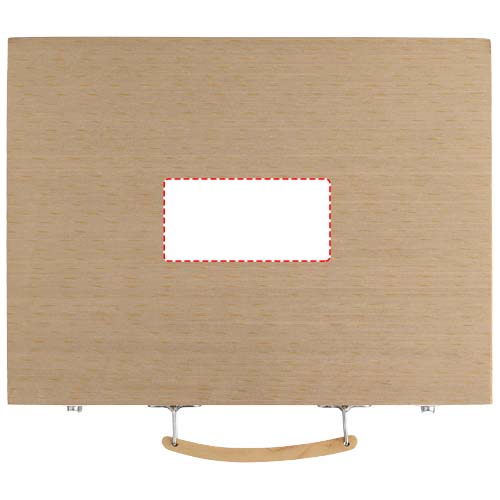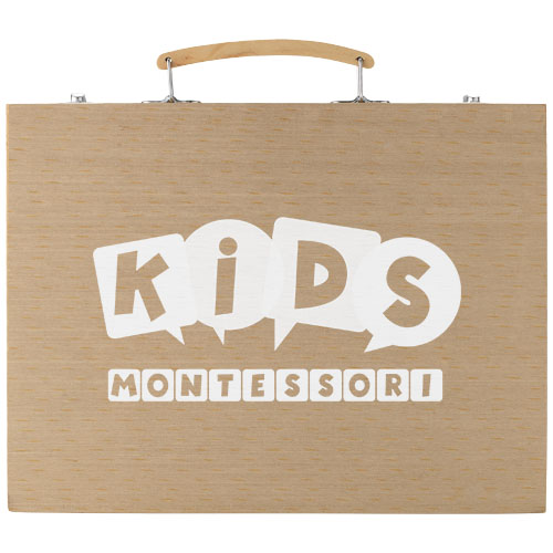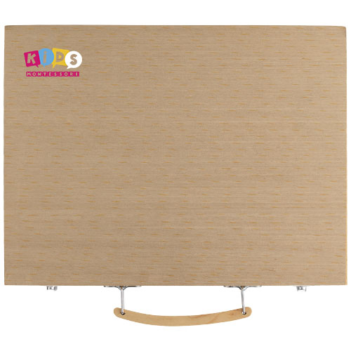 Zestaw zawiera: 12 farb wodnych, 12 kredek ołówkowych, 12 markerów, 12 farb pastelowych, 12 kredek świecowych, paletę, klej, gumkę, temperówkę, ołówek HB, pędzel, wszystko w drewnianej skrzynce. Nadruk niemożliwy na poszczególnych elementach.