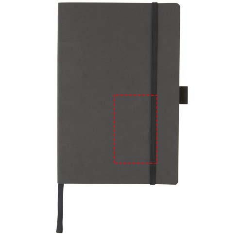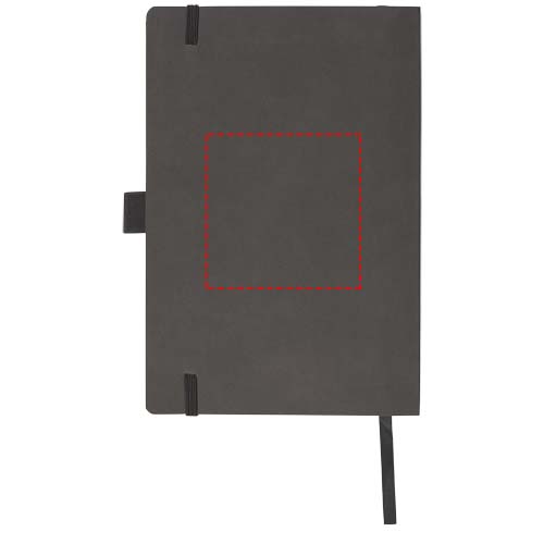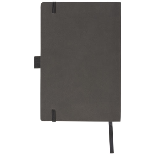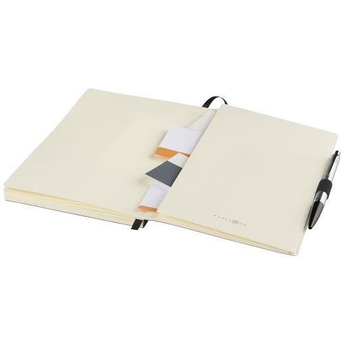 Elastyczny i miękki w dotyku notatnik (rozmiar A5) z wbudowanym elastycznym zamknięciem, wstążką, pętelką na długopis, kieszenią na dokumenty po wewnętrznej stronie okładki i 80 arkuszami (80 g) kremowego papieru w linię. Czarne opakowanie.