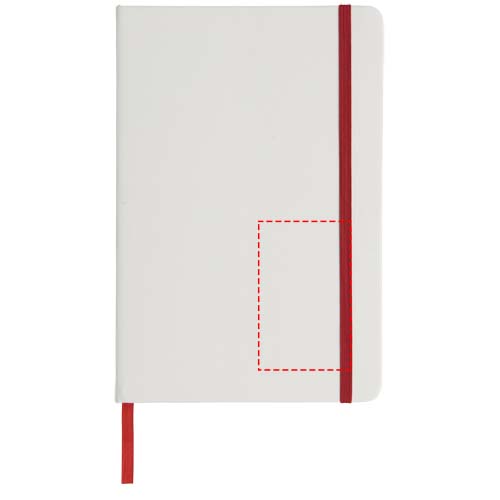 Notatnik A5 z zamknięciem na kolorową gumkę i tasiemką. 80 kartek w linie (gramatura 60 g/m²). Na okładce można wykonać zdobienie drukiem cyfrowym.