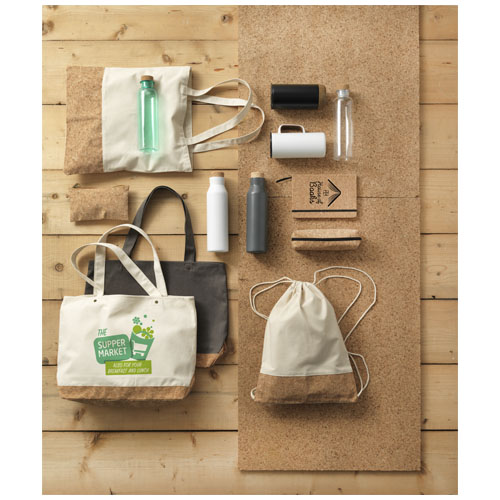 Notes rozmiaru A5 z okładką z korka, zamykany na czarną gumkę ze wstążką. 80 kartek w linie (gramatura 70 g/m²).