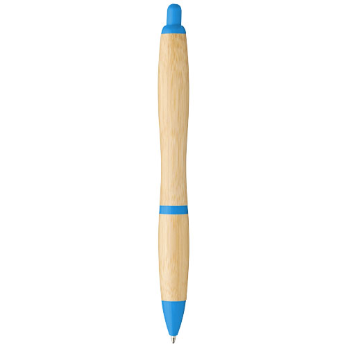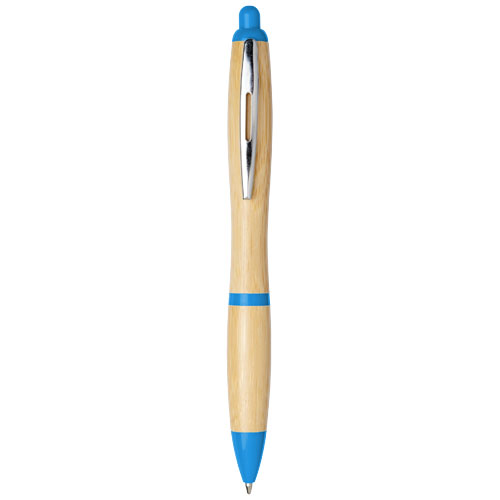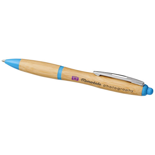 Przyjazny dla środowiska długopis automatyczny z korpusem wykonanym z bambusa, zaakcentowanym chromowanym klipsem i plastikowymi wykończeniami z plastiku ABS. Kolor materiału bambusowego może się różnić.