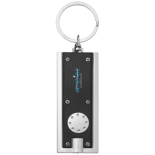 Brelok z białą diodą LED, włączany przyciskiem. Metalowe kółko do kluczy. Baterie w zestawie.