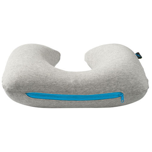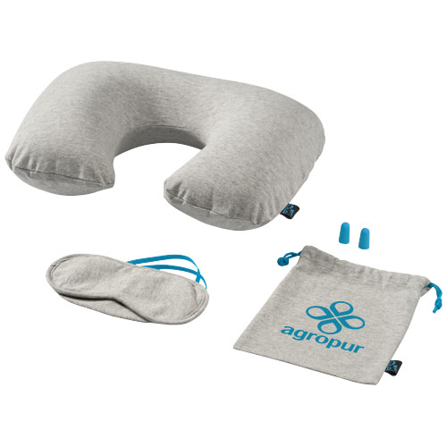 Miękki i delikatny zestaw podróżny zawiera dmuchaną poduszkę z jasnoniebieskim zamkiem, maskę na twarz z jasnoniebieską gumką oraz jasnoniebieskie zatyczki do uszu. Zestaw jest spakowany w miękki pokrowiec zamykany jasnoniebieskim sznurkiem.