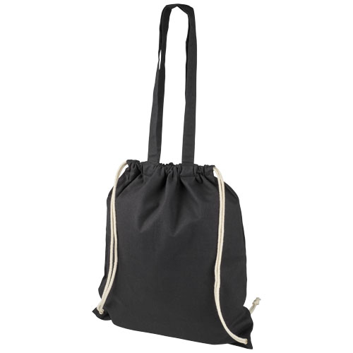 Wielofunkcyjna bawełniana torba z długimi uchwytami i sznurkiem ściągającym, która może być noszona jako torba na zakupy lub plecak. Duża komora główna z zamknięciem na sznurek do ściągania. Posiada dwa opadające uchwyty o długości 31 cm. Pojemność: 1.5 L, wytrzymałość do 5 kg.