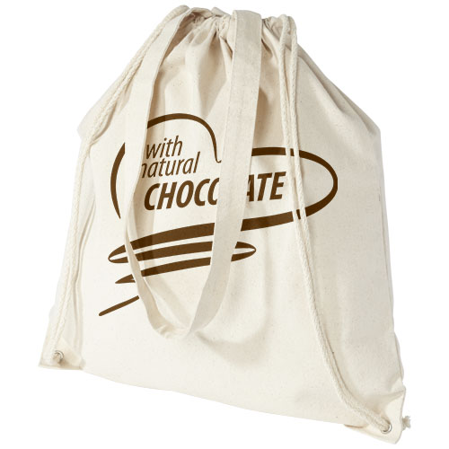 Wielofunkcyjna bawełniana torba z długimi uchwytami i sznurkiem ściągającym, która może być noszona jako torba na zakupy lub plecak. Duża komora główna z zamknięciem na sznurek do ściągania. Posiada dwa opadające uchwyty o długości 31 cm. Pojemność: 1.5 L, wytrzymałość do 5 kg.