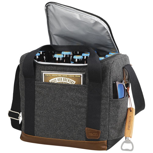 Część serii Campster Field & Co.®. Inspiracja pochodzi z obozów retro i dawnych skautów, jednocześnie ciekawe połączenie ze współczesnymi trendami. Ta stylowa torba wykonana z połączenia wełny i z akcentami materiału poly i winylu, z funkcją izolowanej chłodziarki, z przedziałkami na butelki. Wkładki oddzielające, wsuwane i tworzące oddzielne przedziałki dla dwunastu poszczególnych butelek 350ml. Gdy nie są w użyciu, można je rozłożyć aby przechowywać je na dnie torby. Zestaw zawiera otwieracz do butelek markowych Field & CO.