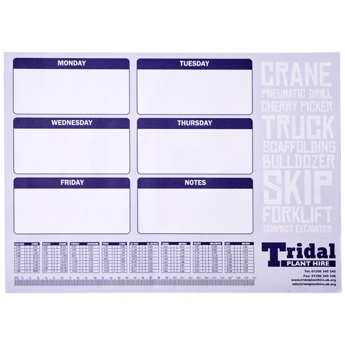 Biały notatnik Desk-Mate® w formacie A2 Składa się z czystych kartek o gramaturze 80g/m2. Standardowo 50 kartek, dostępny również w wersjach 25 lub 100 kartek. Możliwość zdobienia każdego arkusza. Wymiar arkusza: 594x420 mm.