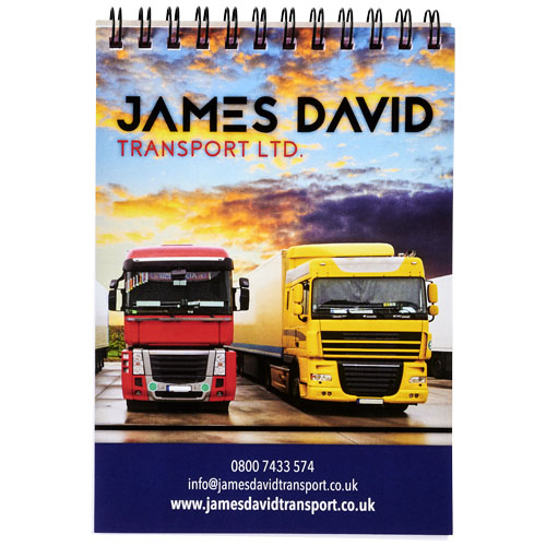 Notes na spirali Desk-Mate® w formacie A6. Notatnik zawiera białą lub czarną przedziałkę. Dostępny w różnych rozmiarach. Obity w lakierowaną, twardą okładkę (250g/m2) z czystymi kartkami (80g/m2). Standardowo 50 kartek, dostępny również w wersji 80 kartek. Możliwość zdobienia okładki i każdego arkusza.