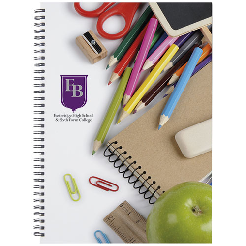 Zawiera 80 arkuszy (80 g/m2) czystych kartek oraz czarną lub białą spiralę. Dostępny w 3 formatach: A4, A5 i A6. Pełne zdobienie w kolorze możliwe na okładce i każdym arkuszu, na stronie przedniej i tylnej.
