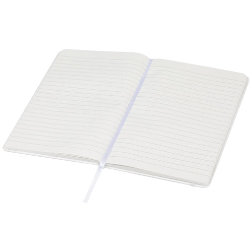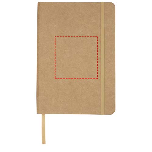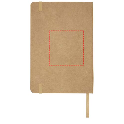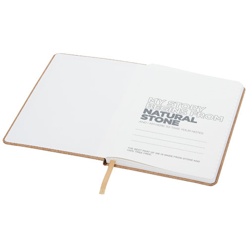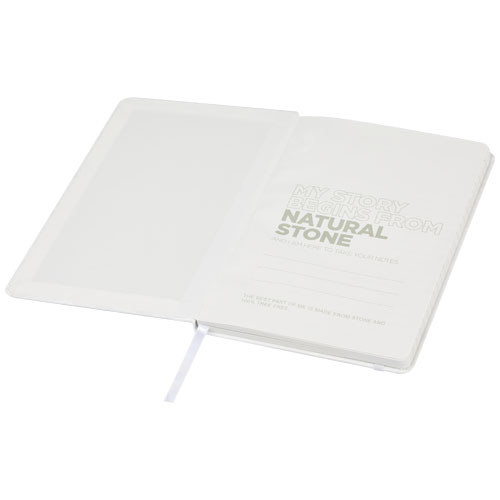 Notatnik odporny na rozdarcia w formacie A5 ze stronami wykonanymi z kamienia. Do wytworzenia papieru z kamienia nie są wykorzystywane drzewa, a proces produkcji zużywa mniej energii w porównaniu z makulaturą lub nową papierem celulozowym. Jest wodoodporny, dzięki czemu rozlane płyny można łatwo zetrzeć. Posiada pasującą kolorystycznie tasiemkę i gumkę oraz 60 arkuszy w linie o gramaturze 120 g/m² z papieru z kamienia. Pakowany w kartonowe opakowanie.
