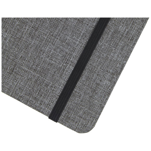 Notatnik w formacie A5 z okładką wykonaną z materiału RPET. Posiada 96 arkuszy w linie o gramaturze 70 g/m² z papieru z recyclingu, pętelkę na pióro i wstążkę. Pakowany w kartonowe opakowanie.