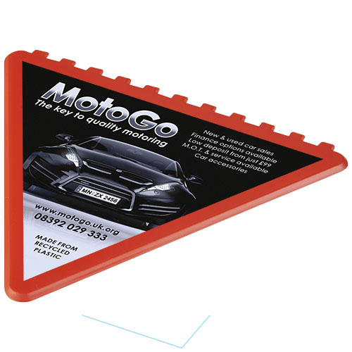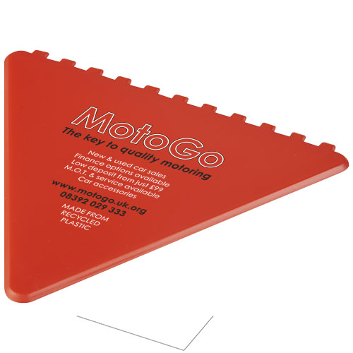 Trójkątny skrobak do skrobania szyby przedniej z dużym obszarem do dekoracji. Wyprodukowano w Wielkiej Brytanii z polistyrenu, tworzywa sztucznego pochodzącego z recyklingu.