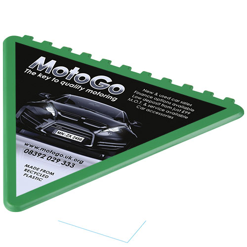 Trójkątny skrobak do skrobania szyby przedniej z dużym obszarem do dekoracji. Wyprodukowano w Wielkiej Brytanii z polistyrenu, tworzywa sztucznego pochodzącego z recyklingu.