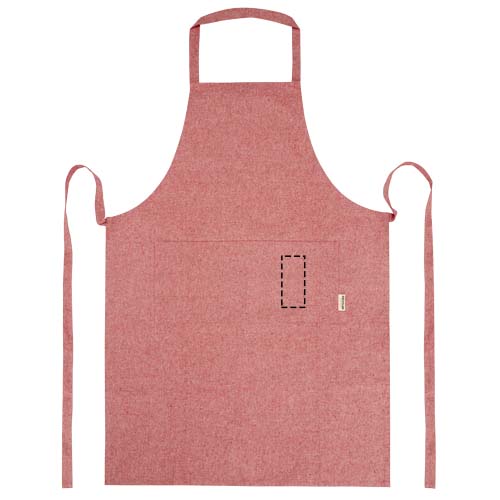Fartuch wykonany z mieszanki bawełny i poliestru z recyklingu o gramaturze 200 g/m². Posiada 2 przylegające kieszenie o łącznych wymiarach 45 x 20 cm oraz wiązanie z tyłu o długości 1 m. Bawełna poddana recyklingowi pochodzi z tzw. wstępnych odpadów konsumpcyjnych wytwarzanych przez zakłady włókiennicze w trakcie procesu cięcia. Ze względu na właściwości bawełny z recyklingu możliwe są niewielkie różnice w kolorze. Ta cecha wyraźnie zwiększa autentyczność wyglądu. Długość paska na szyję: 55 cm.