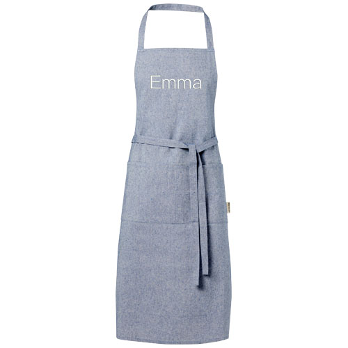 Fartuch wykonany z mieszanki bawełny i poliestru z recyklingu o gramaturze 200 g/m². Posiada 2 przylegające kieszenie o łącznych wymiarach 45 x 20 cm oraz wiązanie z tyłu o długości 1 m. Bawełna poddana recyklingowi pochodzi z tzw. wstępnych odpadów konsumpcyjnych wytwarzanych przez zakłady włókiennicze w trakcie procesu cięcia. Ze względu na właściwości bawełny z recyklingu możliwe są niewielkie różnice w kolorze. Ta cecha wyraźnie zwiększa autentyczność wyglądu. Długość paska na szyję: 55 cm.