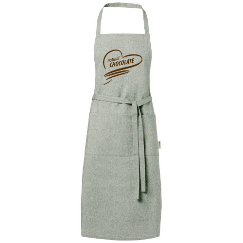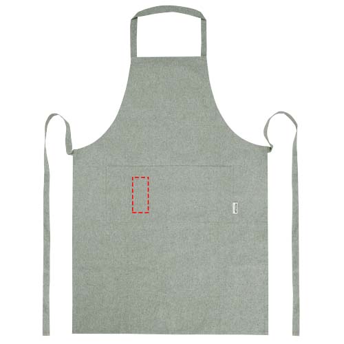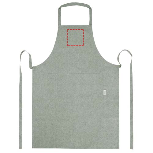 Fartuch wykonany z mieszanki bawełny i poliestru z recyklingu o gramaturze 200 g/m². Posiada 2 przylegające kieszenie o łącznych wymiarach 45 x 20 cm oraz wiązanie z tyłu o długości 1 m. Bawełna poddana recyklingowi pochodzi z tzw. wstępnych odpadów konsumpcyjnych wytwarzanych przez zakłady włókiennicze w trakcie procesu cięcia. Ze względu na właściwości bawełny z recyklingu możliwe są niewielkie różnice w kolorze. Ta cecha wyraźnie zwiększa autentyczność wyglądu. Długość paska na szyję: 55 cm.