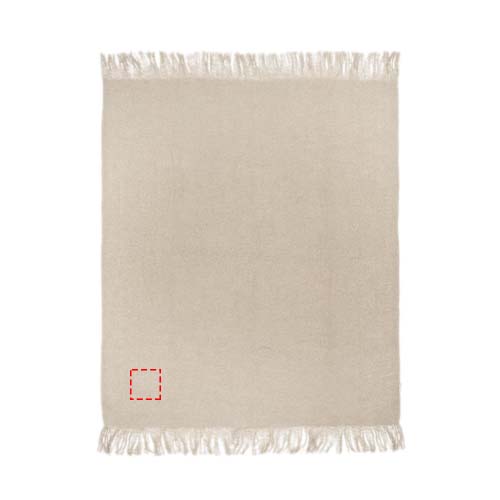 Niezwykle miękki koc z plastiku z recyklingu, owinięty wstążką z plastiku 190T z recyklingu. Pakowane w torebkę z polietylenu pochodzącego z recyklingu. Długość frędzli: 10 cm z każdej strony. Rozmiar wstążki: 72 cm x 4 cm.