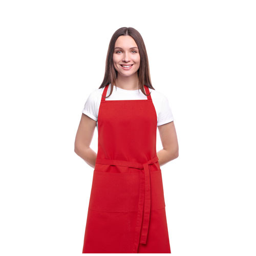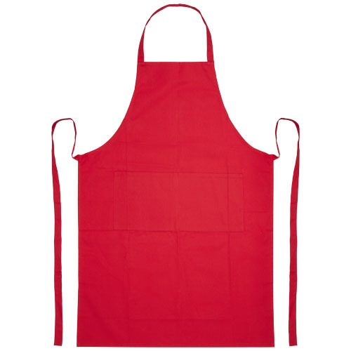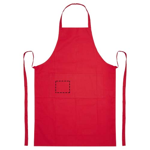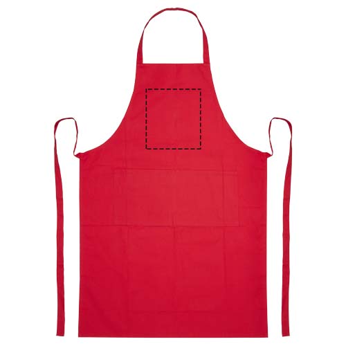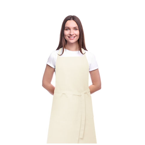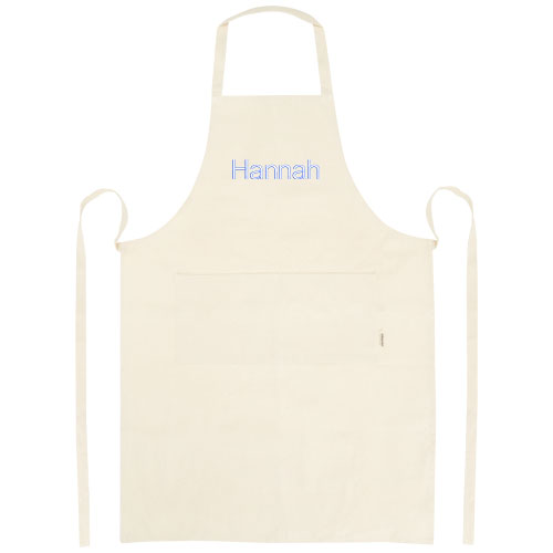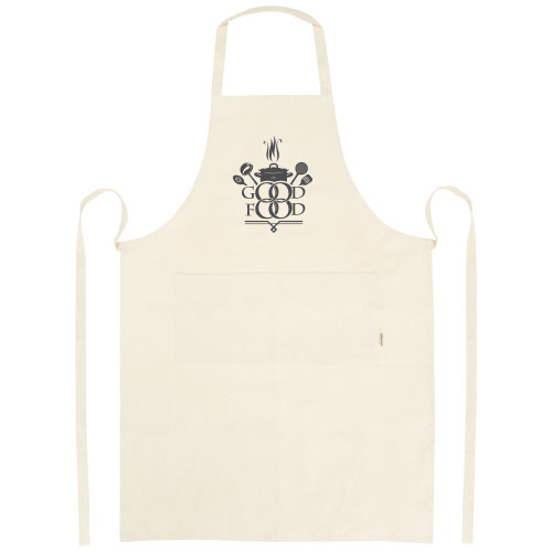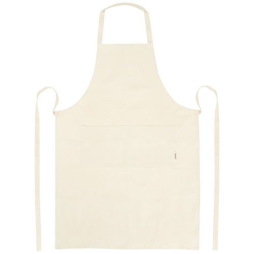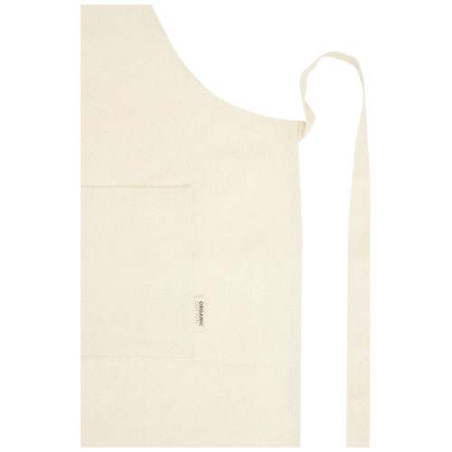 Fartuch zgodny z zasadami zrównoważonego rozwoju wykonany z bawełny organicznej o gramaturze 200 g/m² z certyfikatem GOTS. Posiada 2 przylegające kieszenie o łącznych wymiarach 45 x 20 cm oraz wiązanie z tyłu o długości 1 m. Długość paska na szyję: 55 cm.