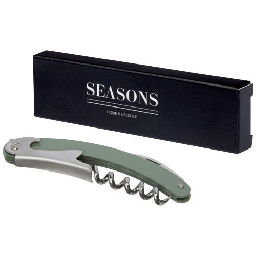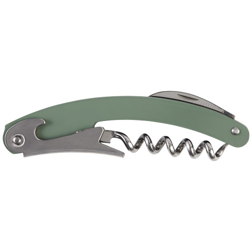 Nóż kelnerski ze stali nierdzewnej z kolorowym korpusem, wyposażony w przecinak do folii i otwieracz do butelek.
