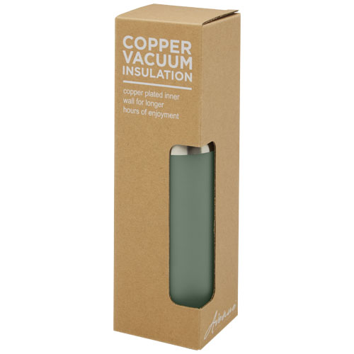 Dzięki swojej prostocie i elegancji ta butelka będzie idealnym prezentem. Butelka posiada pokrywkę ze stali nierdzewnej z ozdobą z organicznego bambusa umieszczoną na górze. Dzięki podwójnym miedzianym ściankom z stali nierdzewnej 18/8 z izolacją próżniową napoje pozostają gorące lub zimne przez kilka godzin. Przetestowany i zatwierdzony zgodnie z niemieckimi przepisami dotyczącymi bezpieczeństwa żywności (LFGB), oraz poddany testom na zawartość ftalanów zgodnie z przepisami REACH. Pojemność 540 ml. Zapakowany w kartonowe pudełko upominkowe wykonane z materiałów pochodzących z recyklingu.