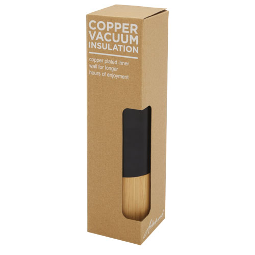 Torne miedziana, izolowana próżniowo butelka ze stali nierdzewnej o pojemności 540 ml z bambusową ścianką zewnętrzną / Czarny