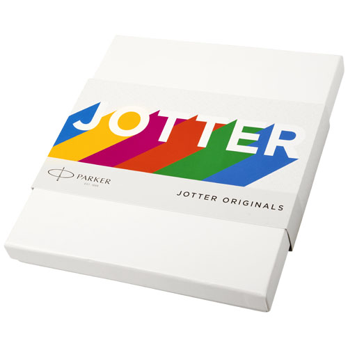 Możesz stworzyć zestaw upominkowy z notatnikiem i piórem o ekskluzywnym wzornictwie. Dowolny długopis Parker Jotter może być łączony z notatnikiem JournalBooks Classic w twardej oprawie (106181) lub kołonotatnikiem (107395) Nova.