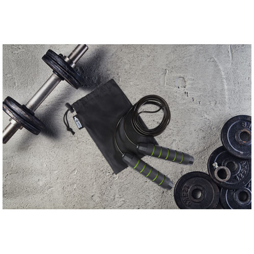 Profesjonalna skakanka dla dorosłych z ergonomicznie ukształtowanymi uchwytami z miękkiej pianki, zapewniającymi pewny i wygodny chwyt podczas treningu. Długość liny wynosi 310 cm, co pozwala na łatwe skakanie dorosłym o wzroście do 195 cm. Lina ma regulowaną długość i wbudowane wysokiej jakości, obracane o 360°, szybkie łożysko kulkowe, które zapewnia płynny obrót bez wysiłku, zapobiegając plątaniu się liny. Dostarczana z woreczkiem do przechowywania (21 x 14 cm) wykonanym z plastiku PET z recyklingu, który oferuje doskonałą powierzchnię do nadruku logo.
