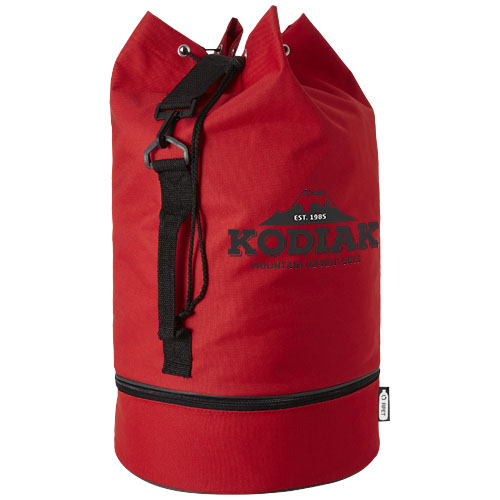 Wodoodporna torba podróżna wykonana z plastiku PET pochodzącego z recyklingu z obszerną główną komorą o pojemności 20 litrów zamykana sznurkiem, z bocznym uchwytem i regulowanym paskiem na ramię. Ma również oddzielną dolną przegrodę zapinaną na zamek błyskawiczny na mniejsze przedmioty.