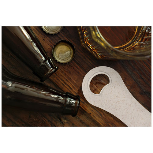 Otwieracz do butelek wykonany ze słomy pszenicznej do otwierania butelek z piwem, napojami bezalkoholowymi itp. Słoma pszeniczna jest pozostałością łodyg po zbiorze ziaren pszenicy, co zmniejsza ilość zużywanego plastiku.
