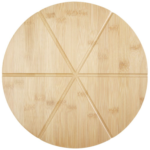 Bambusowa łopata do pizzy z 6 rowkami do krojenia i porcjowania, nóż i łopatka do pizzy. Użyty bambus jest pozyskiwany i produkowany zgodnie z normami zrównoważonego rozwoju.