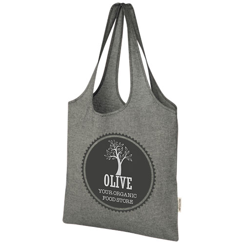 Torba na zakupy o pojemności 150 g/m² z modnym designem z otwartą główną komorą i uchwytami o długości 25 cm. Wykonana z bawełny pochodzącej z recyklingu i w pełni nadająca się do wielokrotnego użytku, dzięki czemu jest świetną alternatywą dla plastikowych toreb.
