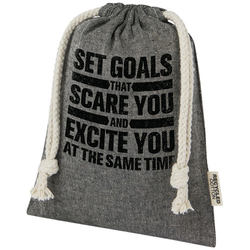 Torba upominkowa wykonana z bawełny z recyklingu z certyfikatem GRS z zamknięciem na sznurek bawełniany. Idealna do prezentów lub przechowywania przedmiotów. Wymiary: 15 x 20 cm.