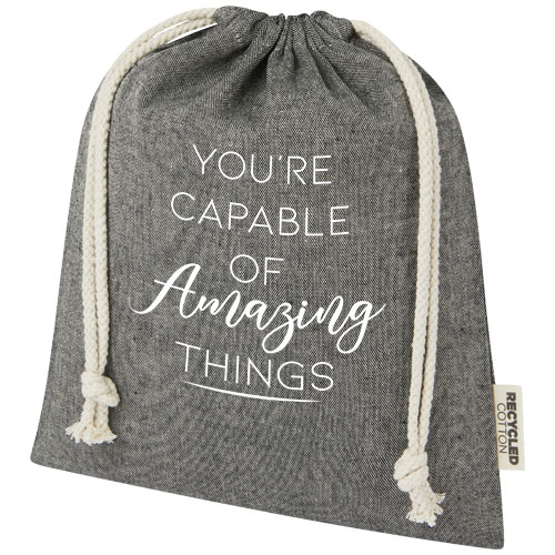 Torba upominkowa wykonana z bawełny z recyklingu z certyfikatem GRS z zamknięciem na sznurek bawełniany. Idealna do prezentów lub przechowywania przedmiotów. Wymiary: 25 x 30 cm.
